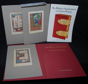 Bening, Simon, Das Blumen-Stundenbuch. Luzern: Faksimile-Verlag, [ca. 1990]. 12 Seiten mit Abbildungen + 3 montierte Tafeln auf Halbkarton. Heft und 3 Tafeln in Leinenmappe. 4to. 406 g* Nur die Dokumentationsmappe. - Mappe etwas angestaubt und fleckig.