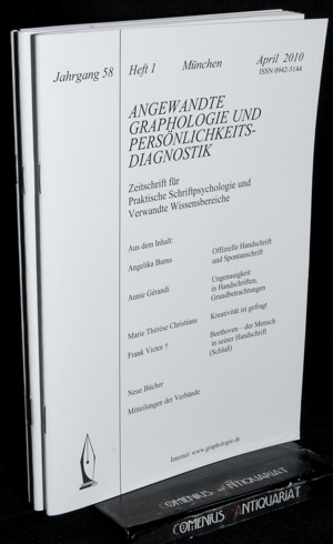 Angewandte Graphologie und Persönlichkeitsdiagnostik. Zeitschrift für praktische Schriftpsychologie und verwandte Wissensbereiche. Jahrgang 58. München: -, 2010. 3 Hefte, 60, 60, 56 Seiten mit Schriftproben. Broschiert. 371 g* Organ der Verbände Berufsverband Geprüfter Graphologen und Psychologen / Organ der Deutschen Graphologischen Vereinigung / Organ der Schweizer Graphologischen Berufsvereinigung u.a. - Beilage der der Schweizerischen Graphologischen Berufsvereinigung.