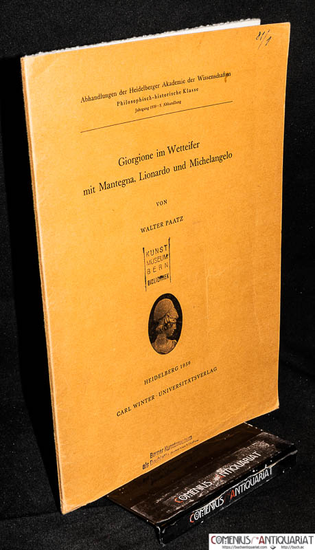 Paatz, Walter, Giorgione im Wetteifer mit Mantegna, Lionardo und Michelangelo. Heidelberg: Winter, 1959. 20 Seiten Text + 31 Abbildungen auf 16 Tafeln. Kartoniert. 4to. 102 g* Abhandlungen der Heidelberger Akademie der Wissenschaften, Philosophisch-Historische Klasse, Jg. 1959, Abh. 3. - Bibliotheksexemplar, diverse Registraturnummern und Stempel.