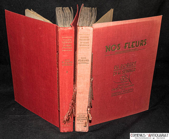 Robert, Philippe et Henri Spinner, Nos fleurs. Histoire naturelle illustrée. Serrières-Neuchâtel:: Chocolat Suchard, 1934-1937. 2 Bände, je VIII, 192 Seiten mit Abbildungen auf montierten Tafeln. Leinen, Blockbindung mit Kordel. 4to. 1870 g* 1: 48 planches en couleurs du peintre Philippe Robert, 135 monographies de fleurs, 48 dessins en noir; 2: 48 aquarelles de Philippe Robert, 143 monographies par Dr Henri Spinner, 48 dessins de Violette Niestlé. - Rückenkanten stellenweise aufgeplatzt, Stempel auf den Innendeckeln, Einband Band 1 lichtrandig.