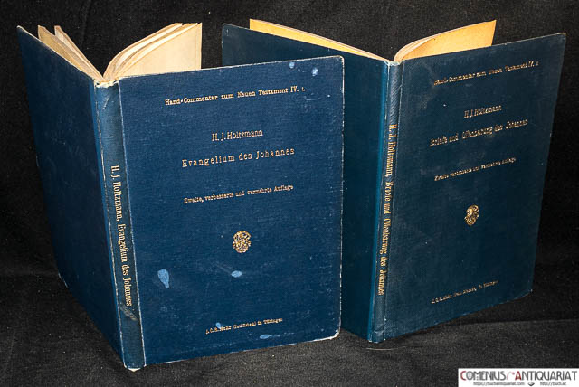 Holtzmann, Heinrich Julius, Das Evangelium des Johannes. Briefe und Offenbarung des Johannes. 2., vermehrte und verbesserte Auflage. Freiburg, Leipzig: J.C.B.Mohr, 1893. VIII, 362 Seiten mit Registern in 2 Bänden. Leinen. Grossoktav. 678 g* Hand-Commentar zum Neuen Testament. 4. Band, 1. und 2. Abtheilung. - Einbände mit Gebrauchsspuren, Exlibris auf den Innendeckeln, stellenweise schwach stockfleckig. Band 1: Name auf dem Titelblatt.
