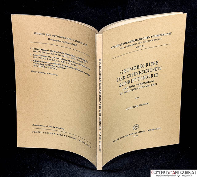 Debon, Günther, Grundbegriffe der chinesischen Schrifttheorie und ihre Verbindung zu Dichtung und Malerei. Wiesbaden: Steiner, 1978. X, 103 Seiten mit Literaturverzeichnis und Register. Broschiert. 239 x 170 mm. 220 g* Studien zur ostasiatischen Schriftkunst, 3. - Gebräunt, obere Ecke leicht bestossen.