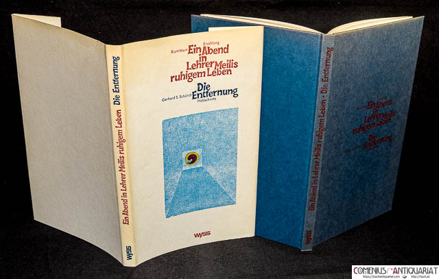 Marti, Kurt, Ein Abend in Lehrer Meilis ruhigem Leben. Erzählung. Bern: Edition Dendron, 1980. ca. 70 Blätter mit Abbildungen. Pappband (gebunden) mit Schutzumschlag. 4to. 276 g* Mit farbigen Holzschnitten von Gerhard S. Schürch unter dem Titel "Die Entfernung". Gesamtauflage 2000 Exemplare. Herstellung in Bleisatz (eine Normal-Gill). Die Blätter nur recto bedruckt. Titelei und Umschlag in Holzschnitt, diese auf Handtiegel abgezogen. - Schutzumschlag und Einband schwach lichtrandig.
