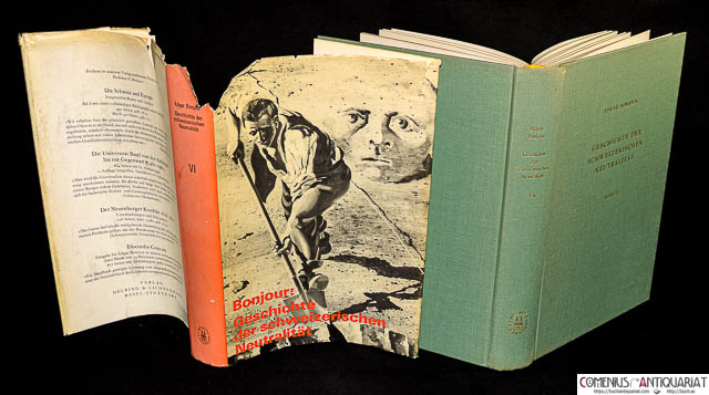 Bonjour, Edgar,  Geschichte der schweizerischen Neutralität [6]. Vier Jahrhunderte Eidgenössischer Aussenpolitik. Band VI: 1939 - 1945. Basel: Helbling & Lichtenhahn, 1970. 430 Seiten mit einer Abbildung als Frontispiz, Register und Zeittafel. Leinen mit Schutzumschlag. Grossoktav. 244 x 165 mm. 1046 g* Mit den wichtigen Kapiteln: Flüchtlingspolitik, Internierung sowie wirtschaftliches Verhältnis zu Deutschland. - Schutzumschlag mit Rissen und Fehlstellen.