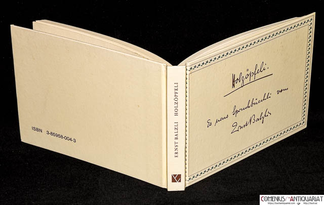 [Balzli, Ernst] Holzöpfeli. Es neus Spruchbüechli vom Ernst Balzli. 8. Auflage. Bern: Victoria, 1980. Unpaginiert, ca. 50 Blätter. Pappband (gebunden). Quer-Oktav. 109 x 153 mm. 118 g* Aus dem Nachlass herausgegeben von Ernst Heimann. Alle Sprüchlein in Faksimile von Balzlis Handschrift.