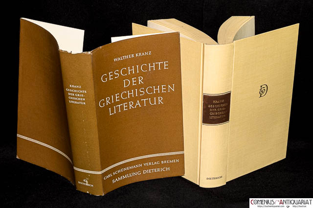 Kranz, Walther, Geschichte der griechischen Literatur. 4. Auflage. Bremen: Schünemann, [1960]. X, 581 Seiten mit Abbildungen und Register. Pappband (gebunden) mit Schutzumschlag. Kleinoktav. 178 x 107 mm. 368 g* Sammlung Dieterich; 42. - Exlibris auf dem Innendeckel.