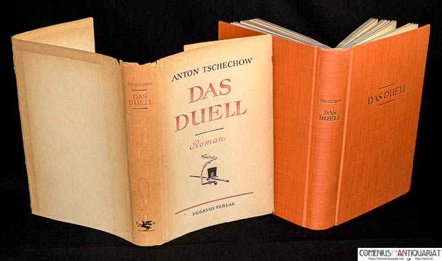 [ echov, Anton Pavlovi ] Anton Tschechow, Das Duell. Roman. Zürich: Pegasus Verlag, 1944. 285 Seiten. Leinen Farbkopfschnitt und mit Schutzumschlag. 190 x 128 mm. * Deutsch von Waldemar Jollos. - Gebräunt, S.237-272 an der unteren Ecke gestaucht, Schutzumschlag lichtrandig und mit kleinen Rissen.
